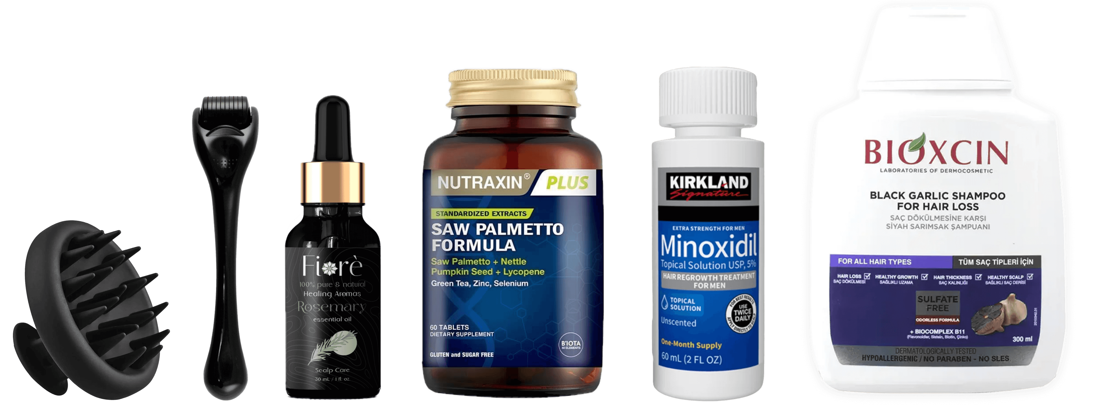 Minoxidil 5%,SAW PALMETTO, Bioxsine შამპუნი, როზმარინის ზეთი, დერმოროლერი და მასაჟორი